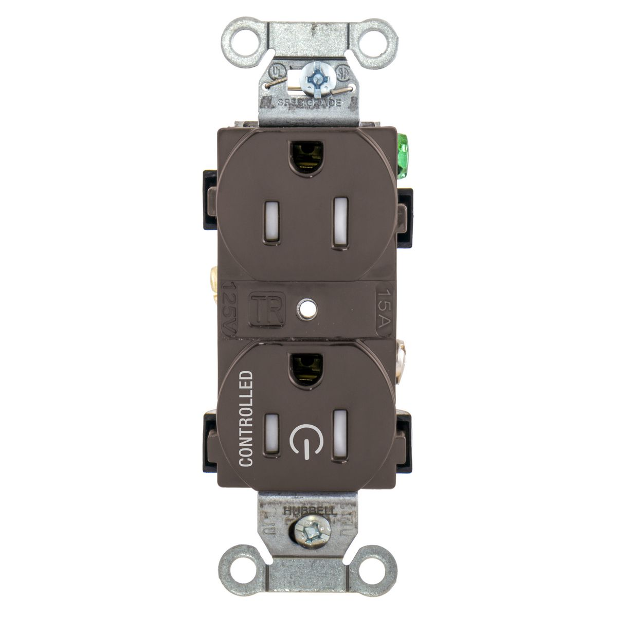 HUBBELL WIRING DEVICE-KELLEMS BR15C1TR Straight Receptacle, Duplex, 1/2 Load Controlled, 15A 125V, B And S Wired, Brown