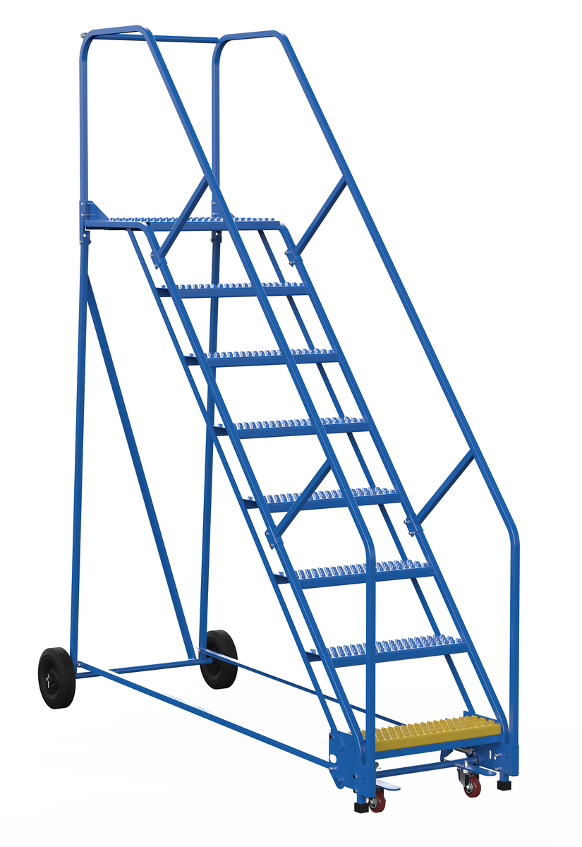 VESTIL LAD-8-21-G-EZ Steel Rolling Warehouse Ladder, 50 Deg, 8 Grip Strut, 23-9/16 Inch Step Width, 350 lb Capacity, Blue